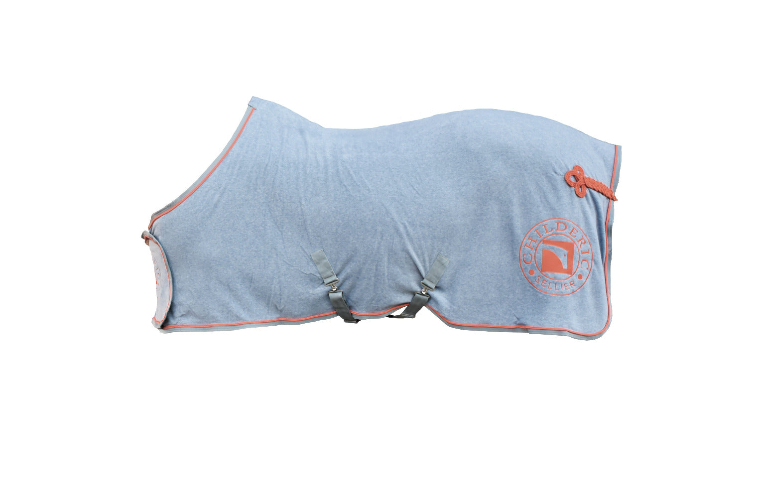 Very soft and supple Childéric fleece rug, gray with orange braided edging. Embroidered Childéric logo on the right and left back. Embroidered front bib with Velcro to protect the two strap attachments and chest hooks. Two adjustable crossed over-girths are present for the ventral attachment and to benefit from excellent support of the blanket, as well as an orange braided tail strap. Comfortable padding of the withers to prevent rubbing. Shirt in breathable and absorbent material.